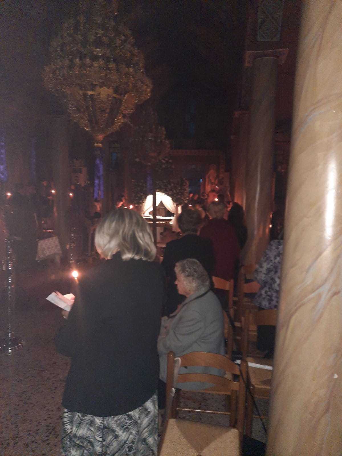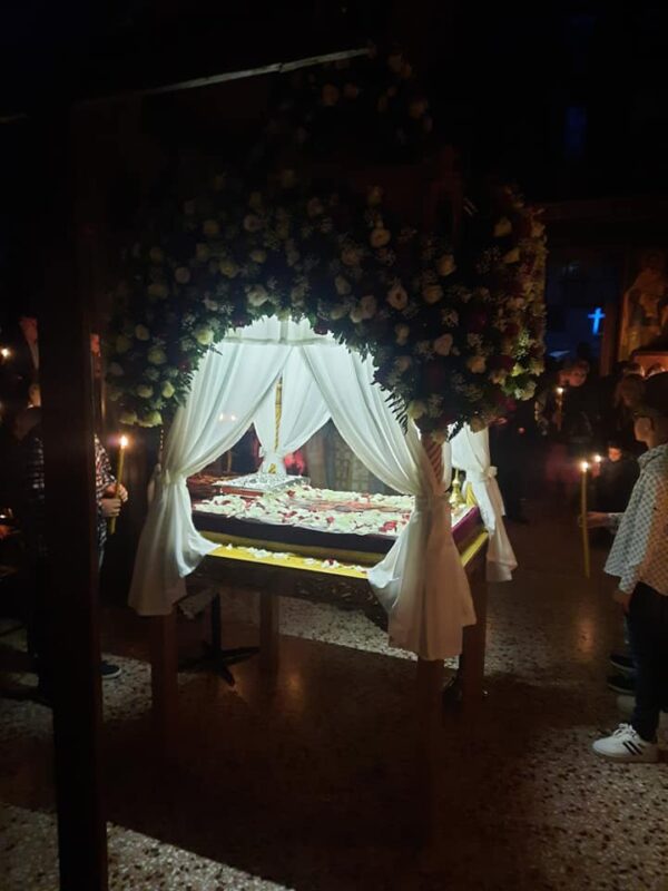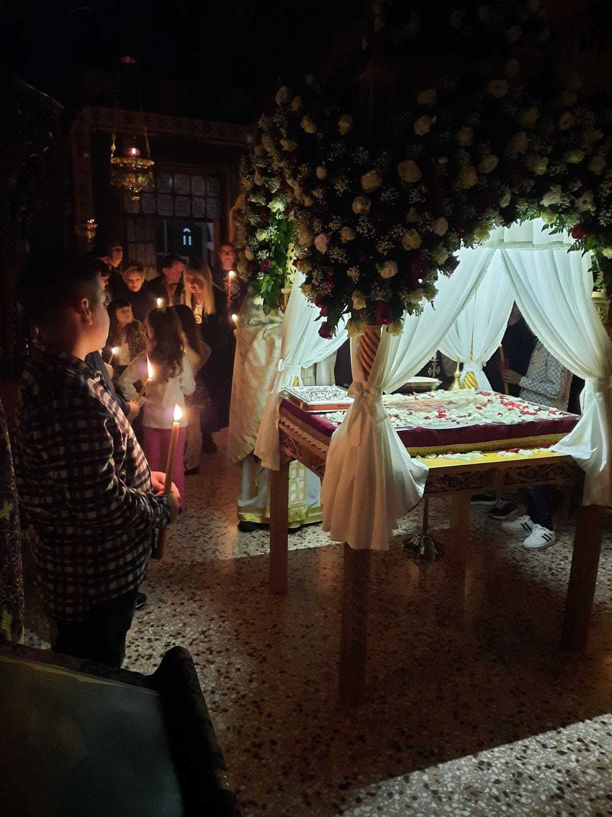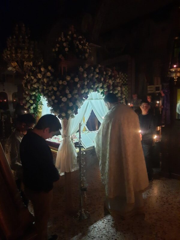 Λίγο μετά το βράδυ της Μεγάλης Παρασκευής, ο Επιτάφιος εξήλθε του ναού για την περιφορά με τους πιστούς να τον συνοδεύουν ψάλλοντας τα εγκώμια και προσδοκώντας το βράδυ του Μεγάλου Σαββάτου την Ανάσταση.