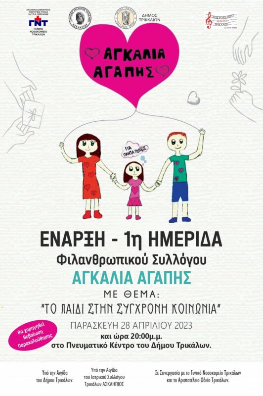 Για σήμερα στις 8 το απόγευμα έχει προγραμματιστεί να διεξαχθεί η πρώτη ημερίδα του Συλλόγου Αγκαλιά της Αγάπης. Η ημερίδα θα πραγματοποιηθεί στο Πνευματικό Κέντρο Δήμου Τρικκαίων και έχει ως θέμα «Το παιδί στην σύγχρονη κοινωνία».
