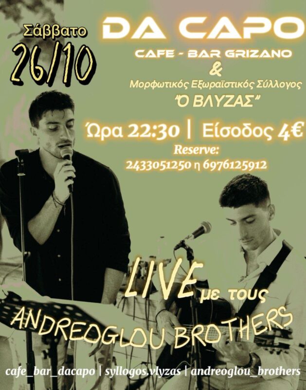 Με σκοπό να προσφέρουν μια αξέχαστη εμπειρία στους θαυμαστές τους, οι Andreoglou Brothers αποδέχθηκαν την πρόταση από τον Σύλλογο του Γριζάνου “Ο ΒΛΥΖΑΣ” και θα εμφανιστούν στο DA CAPO, φέρνοντας μαζί τους τη μαγεία της μουσικής. Η βραδιά θα είναι γεμάτη έντεχνα ακούσματα που θα μας ταξιδέψουν, λαϊκά κομμάτια που θα μας κάνουν να ερωτευτούμε ξανά, και χορευτικά που θα μας ενώσουν σε έναν παράλληλο ρυθμό.