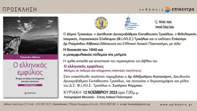 Ο Δήμος Τρικκαίων, η Διεύθυνση Δευτεροβάθμιας Εκπαίδευσης Τρικάλων, ο Φιλολογικός, Ιστορικός, Λογοτεχνικός Σύνδεσμος (Φ.Ι.Λ.Ο.Σ.) Τρικάλων και οι εκδόσεις Επίκεντρο διοργανώνουν ομιλία του Δρ Ραϋμόνδου Αλβανού, διδάσκοντα στο Ελληνικό Ανοικτό Πανεπιστήμιο, με τίτλο «Η δεκαετία του 1940 και ο μετεμφυλιακός πόλεμος της μνήμης».