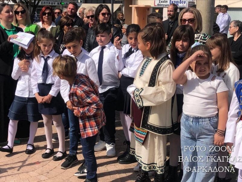 Εκατοντάδες Φαρκαδόνιοι κατέκλυσαν την κεντρική οδό μπροστά από την κεντρική πλατεία για να χειροκροτήσουν τα παιδιά, τους μαθητές και τα νήπια που αποτελούν το μέλλον του τόπου, την ελπίδα.