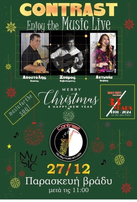 Σήμερα Παρασκευή 27 Δεκεμβρίου, στις 11 το βράδυ, το καφέ «Contrast» στην πλατεία της Φαρκαδόνας σας προσκαλεί σε μια αξέχαστη βραδιά γεμάτη μουσική και εορταστική ατμόσφαιρα! Ελάτε να απολαύσουμε μαζί ζωντανές ερμηνείες από τους ταλαντούχους καλλιτέχνες Αποστόλη Σακκά, Αντωνία Βισβίκη και Σπύρο Καβαλλιεράτο, οι οποίοι θα μας ταξιδέψουν με τις μελωδίες τους.