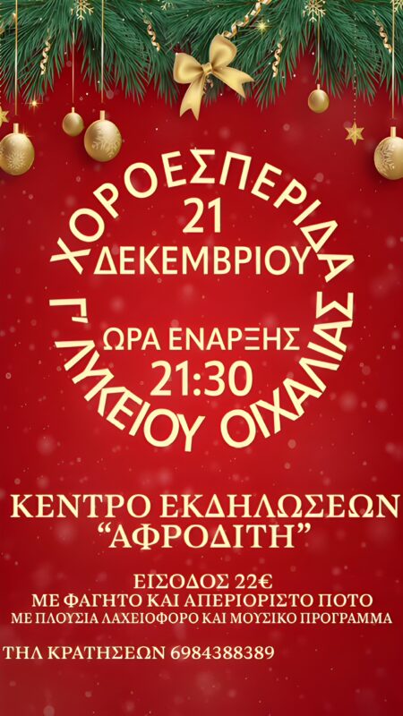 Στο κοσμικό κέντρο «Αφροδίτη» της Οιχαλίας δίνουν ραντεβού το Σάββατο 21 Δεκεμβρίου οι μαθητές της Γ΄ τάξης του ΓΕΛ Οιχαλίας, πραγματοποιώντας την ετήσια χοροεσπερίδα τους.