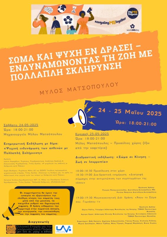 «Σώμα και Ψυχή εν Δράσει – Ενδυναμώνοντας τη ζωή με Πολλαπλή Σκλήρυνση», στις 24 και 25 Μαΐου, στον φιλόξενο χώρο του Μύλου Ματσόπουλου.