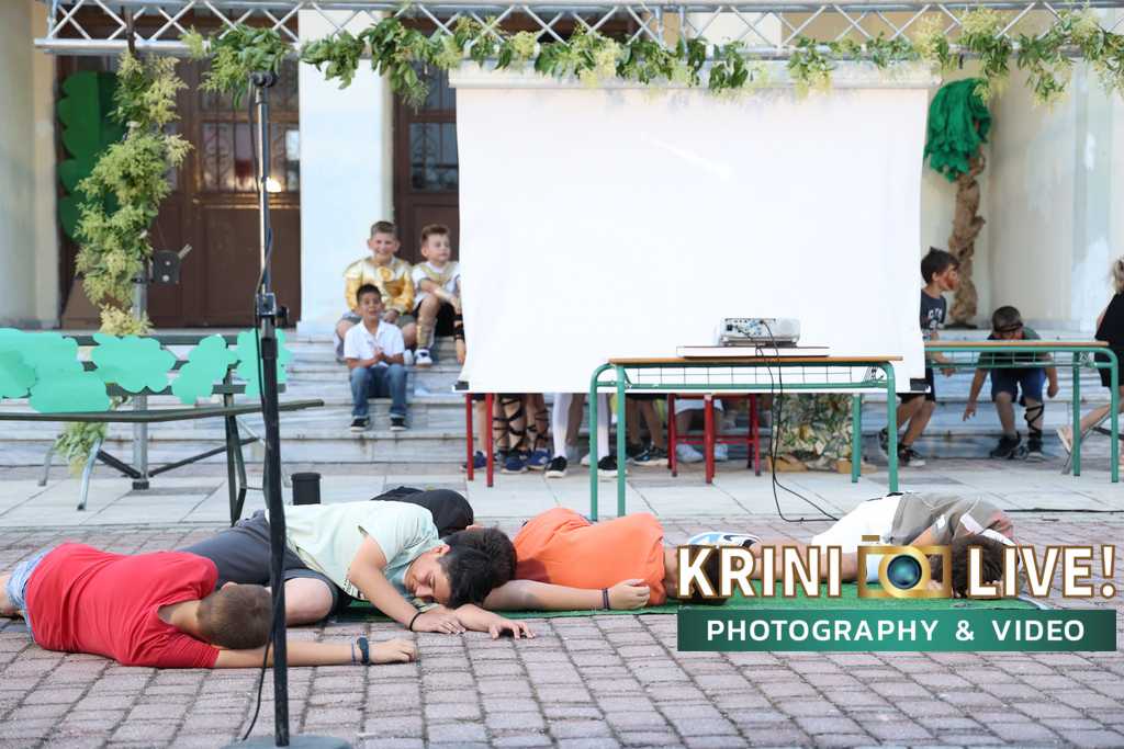 Η θεατρική παράσταση των μαθητών, με τίτλο «Ταξίδι στο Χρόνο», κατάφερε να σκορπίσει γέλιο, χαρά αλλά και συγκίνηση. Οι μικροί πρωταγωνιστές – κυρίως τα παιδιά των δύο μεγαλύτερων τάξεων – παρουσίασαν ένα νοητό ταξίδι από την πρωτογενή κοινωνία και την Αρχαία Ελλάδα, μέχρι το μέλλον, σε έναν κόσμο… χωρίς σχολεία!
