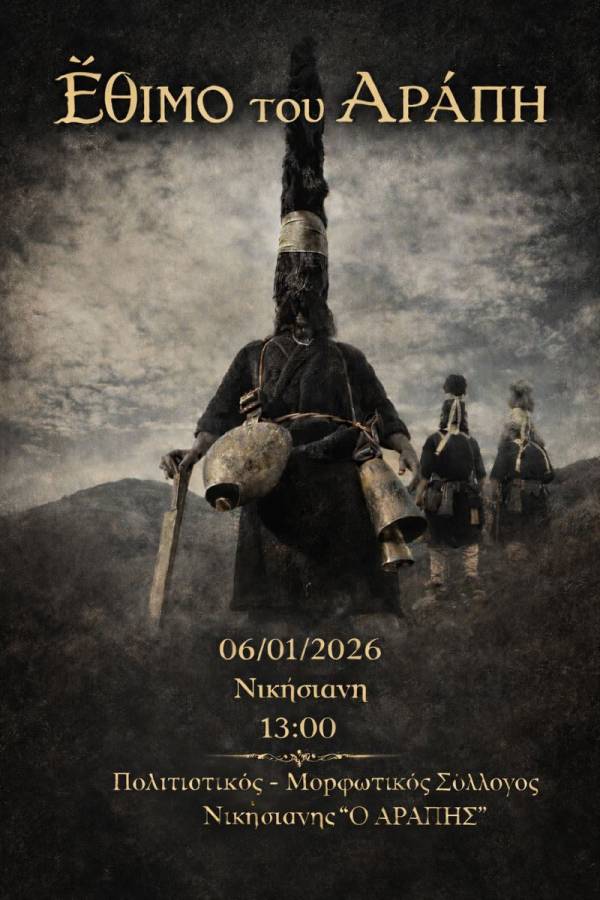 Ανήμερα των Φώτων στις 6 Ιανουαρίου ο Πολιτιστικός – Μορφωτικός Σύλλογος Νικήσιανη στη 13:00 το μεσημέρι παρουσιάζει το έθιμο του Αράπη.