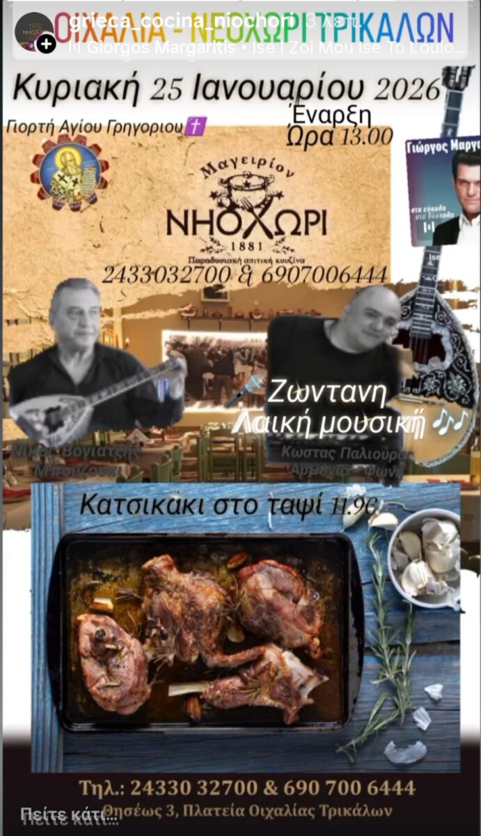 Μια ξεχωριστή κυριακάτικη γαστρονομική και μουσική εμπειρία ετοιμάζει το Μαγειρείο «Νηοχώρι» στην καρδιά της Οιχαλίας Τρικάλων.