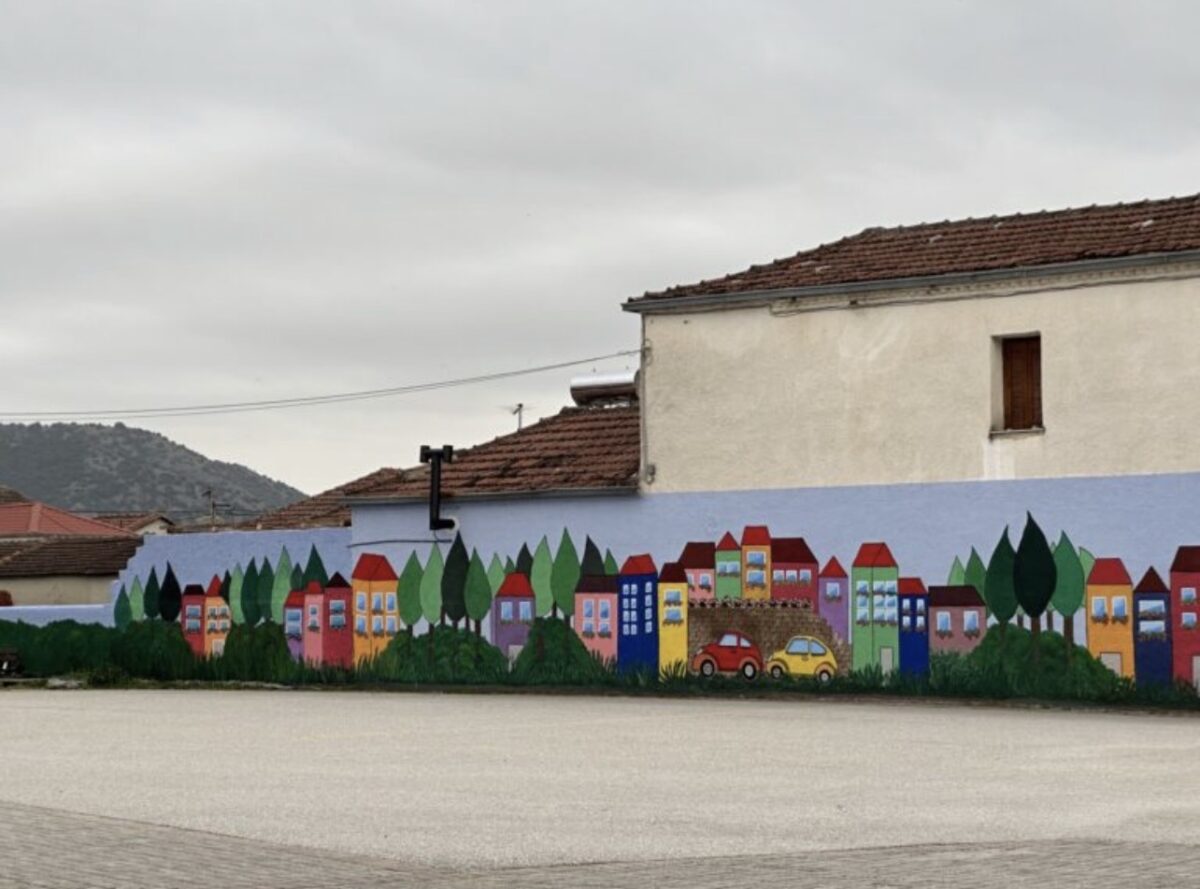 Αμέσως μετά, την προσοχή μας τράβηξε ένας εντυπωσιακός τοίχος στην αυλή. Ο μεγάλος τυφλός τοίχος του παρακείμενου σπιτιού, στη νότια πλευρά του σχολείου, έχει μετατραπεί σε έναν καμβά τέχνης. Μια μεγάλη ζωγραφιά, έργο της διευθύντριας του σχολείου κ. Ελένης Τζαβέλλα, κοσμεί τον χώρο. Παράλληλα, παλιά αντικείμενα που προορίζονταν για απόρριψη έχουν καθαριστεί και διακοσμηθεί από την ίδια και τους εκπαιδευτικούς, συμβάλλοντας στην αισθητική αναβάθμιση της αυλής.