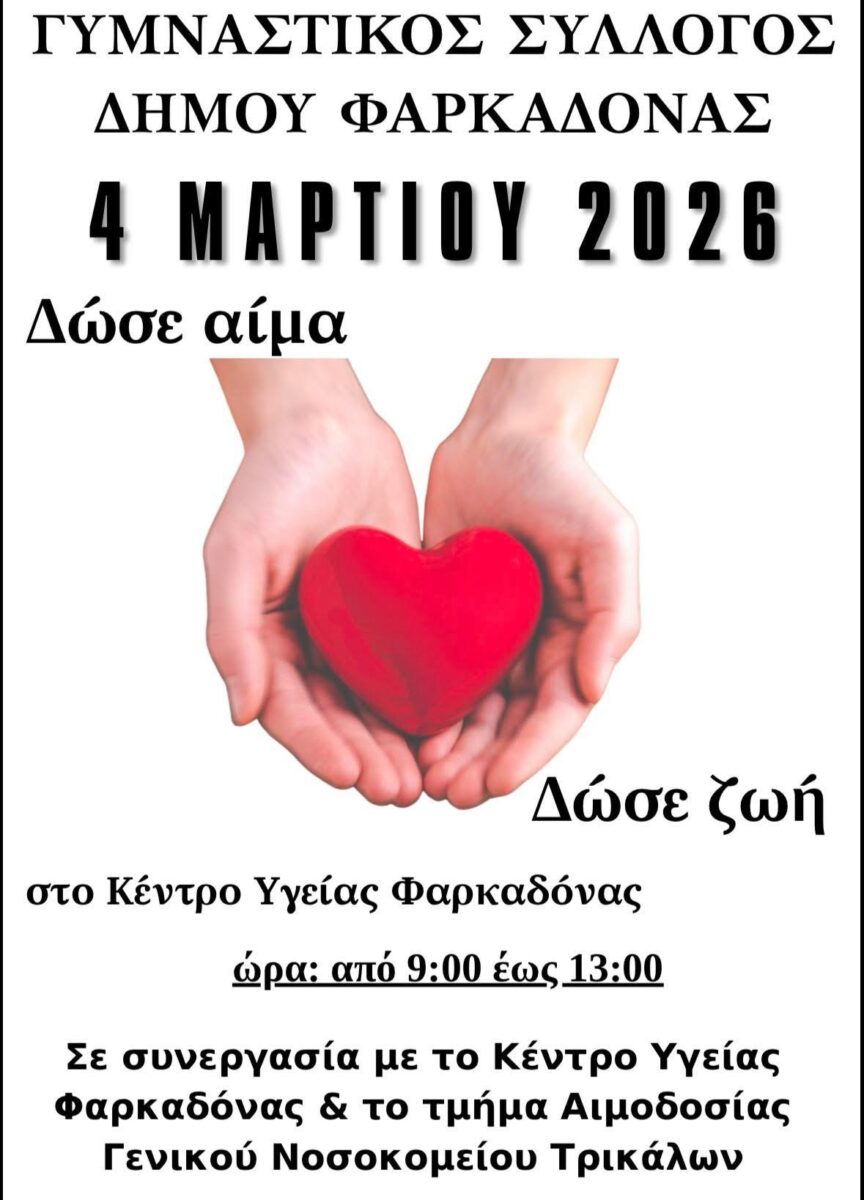 Ο Γυμναστικός Σύλλογος Δήμου Φαρκαδόνας διοργανώνει εθελοντική αιμοδοσία, στέλνοντας το μήνυμα: