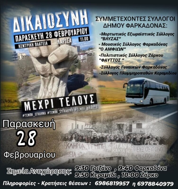 Έξι Σύλλογοι του Δήμου Φαρκαδόνας ενώνουν τις δυνάμεις τους και καλούν όλους τους πολίτες να συμμετάσχουν στην πορεία διαμαρτυρίας για τα Τέμπη, που θα πραγματοποιηθεί την Παρασκευή 28 Φεβρουαρίου στη Λάρισα.