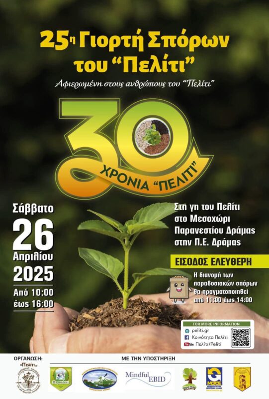 Ο Πολιτιστικός Σύλλογος Κρήνης διοργανώνει ημερήσια εκδρομή το Σάββατο 26 Απριλίου 2025 στο Μεσοχώρι Παρανεστίου Δράμας, για να συμμετάσχει στην 25η Γιορτή Σπόρων του Πελίτι, μια ξεχωριστή γιορτή αφιερωμένη στην αυτάρκεια, τη γη, την παράδοση και τον πολιτισμό.