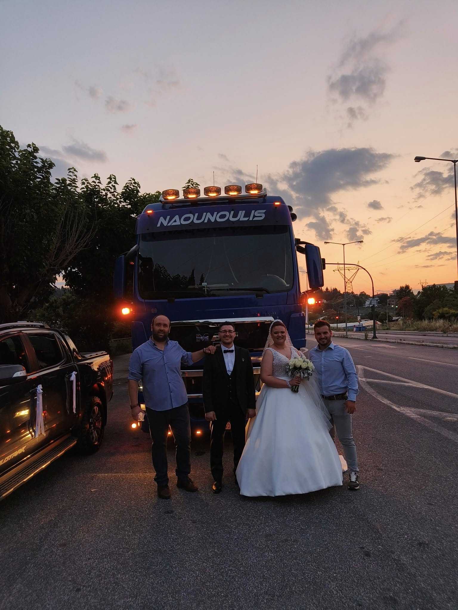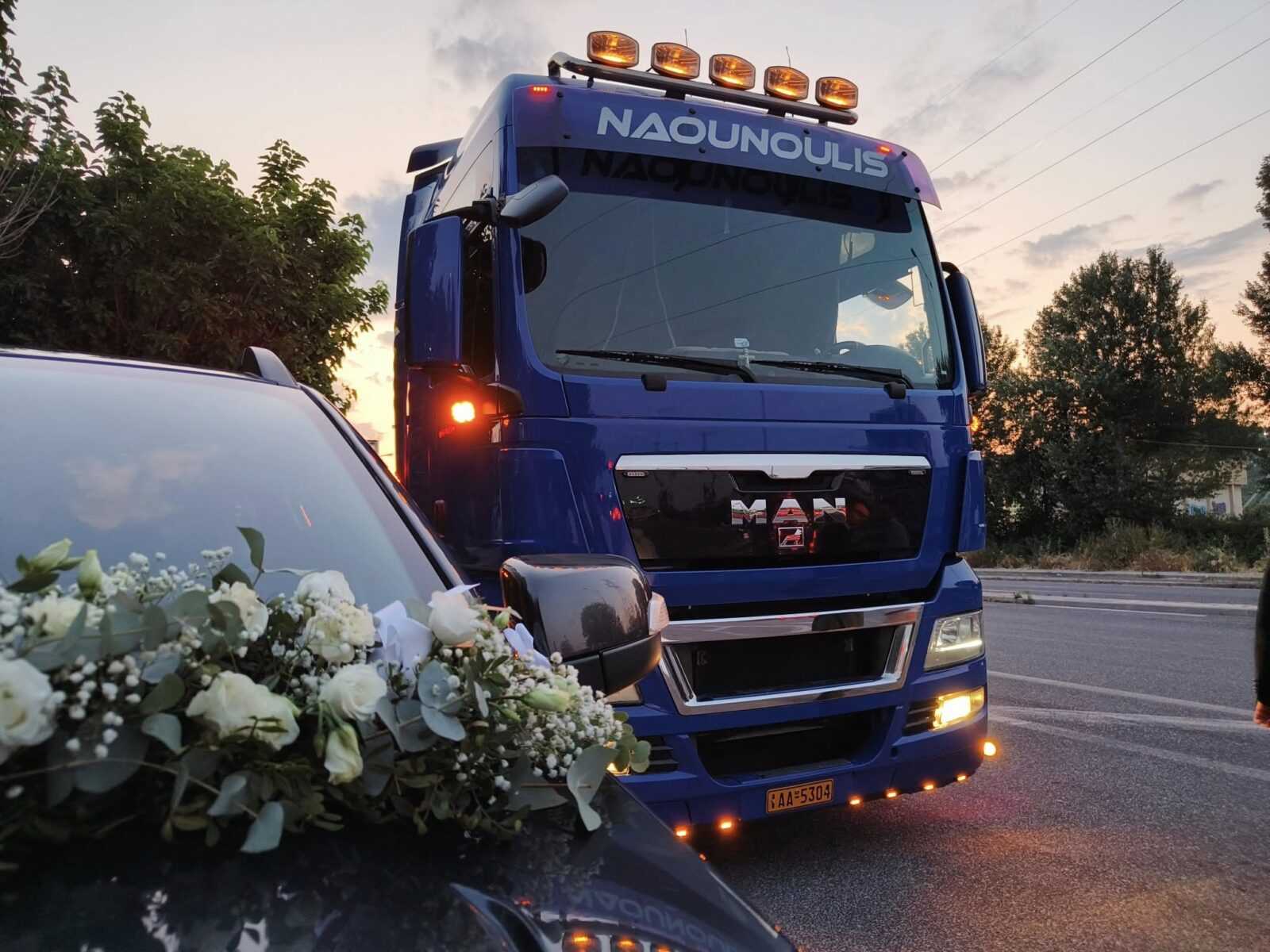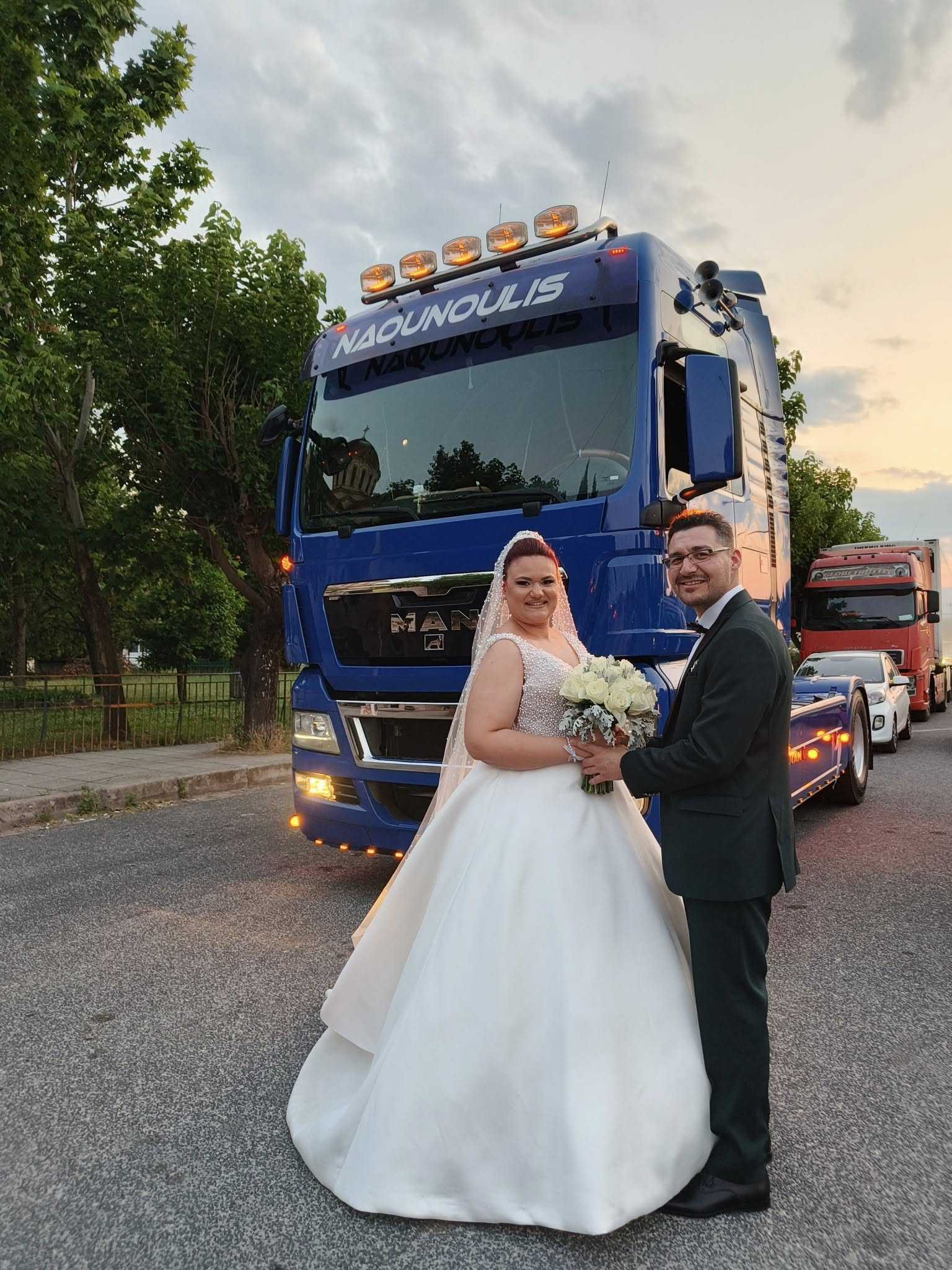 Το φορτηγό είχε στολίσει με φροντίδα και αγάπη ο καλός του φίλος και επαγγελματίας του χώρου, Θοδωρής Ναουνούλης, βάζοντας λευκές κορδέλες στο όχημα και συνοδεύοντας το ζευγάρι με τιμή και συγκίνηση.
