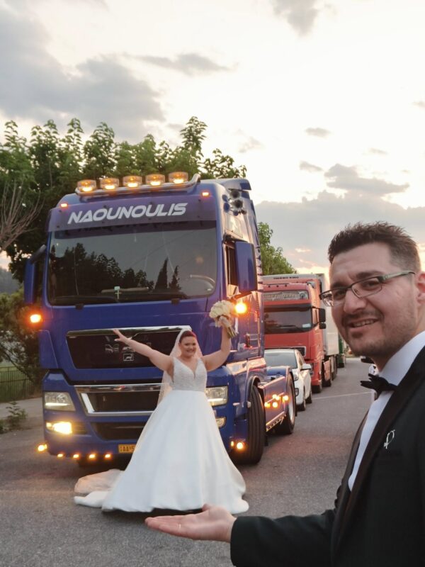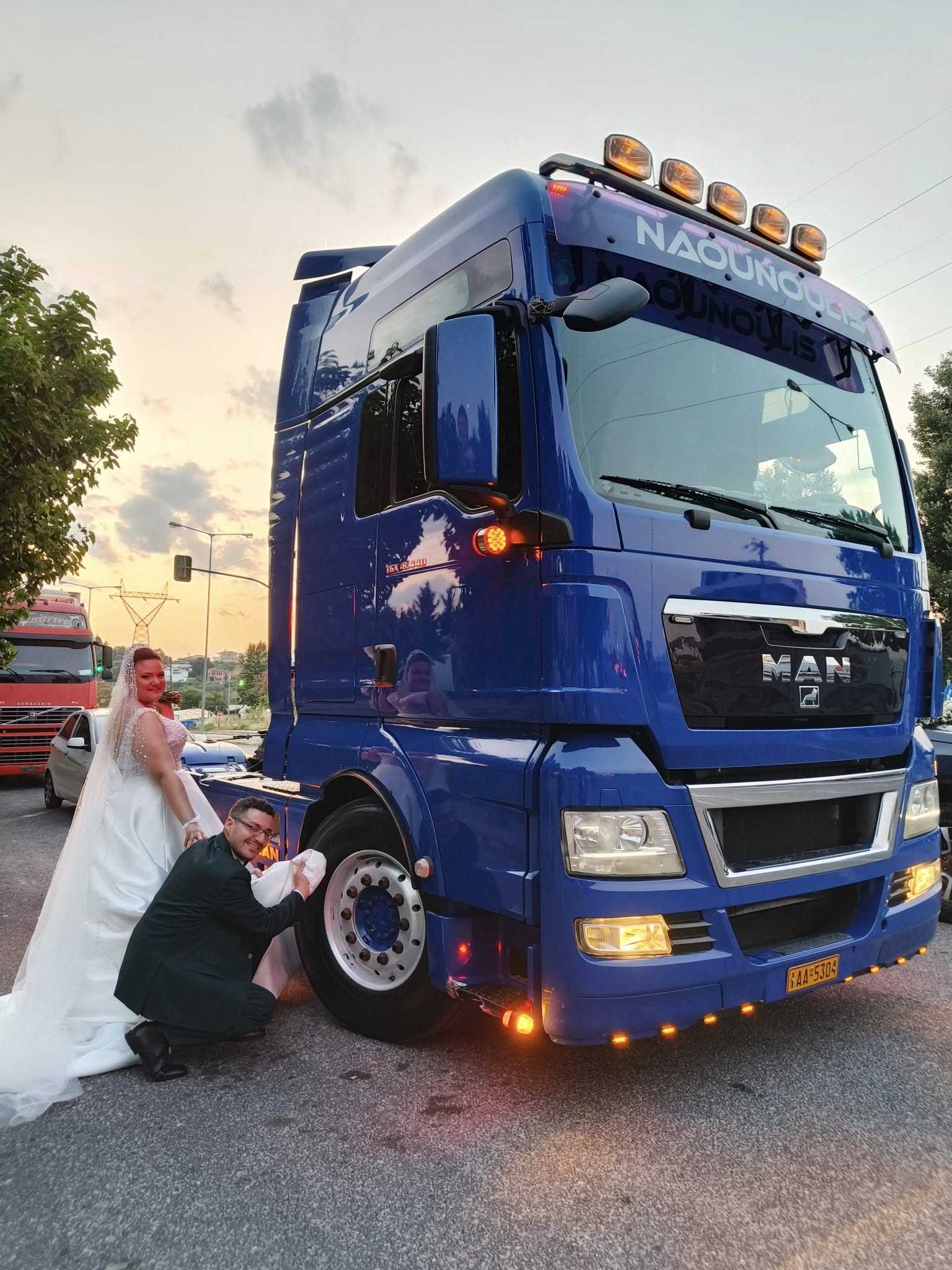 Ο Γιάννης, που για χρόνια ταξίδευε ως οδηγός φορτηγών ψυγείων σε διεθνείς μεταφορές, δεν ξέχασε ποτέ την αγάπη του για τα μεγάλα οχήματα. Έτσι, στην πιο σημαντική μέρα της ζωής του, τη μέρα του γάμου του με την εκλεκτή της καρδιάς του, Θώμη, διάλεξε να φτάσει στον Ιερό Ναό Αγίου Νεκταρίου Τρικάλων όχι με λιμουζίνα, αλλά με έναν τράκτορα ΜΑΝ – συμβολικό και αγαπημένο.