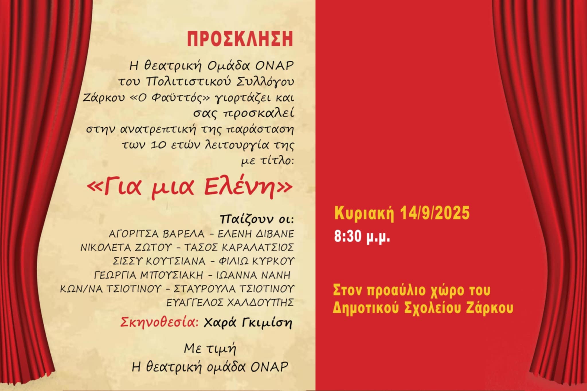 Μια ξεχωριστή πολιτιστική βραδιά ετοιμάζει ο Πολιτιστικός Σύλλογος Ζάρκου την Κυριακή 14 Σεπτεμβρίου. Η θεατρική ομάδα ΟΝΑΡ, με αφορμή τη συμπλήρωση δέκα χρόνων συνεχούς και ενεργής παρουσίας, ανεβάζει ξανά την ανατρεπτική κωμωδία «Για μια Ελένη», προσφέροντας γέλιο, συγκίνηση και δημιουργική ενέργεια στο κοινό.