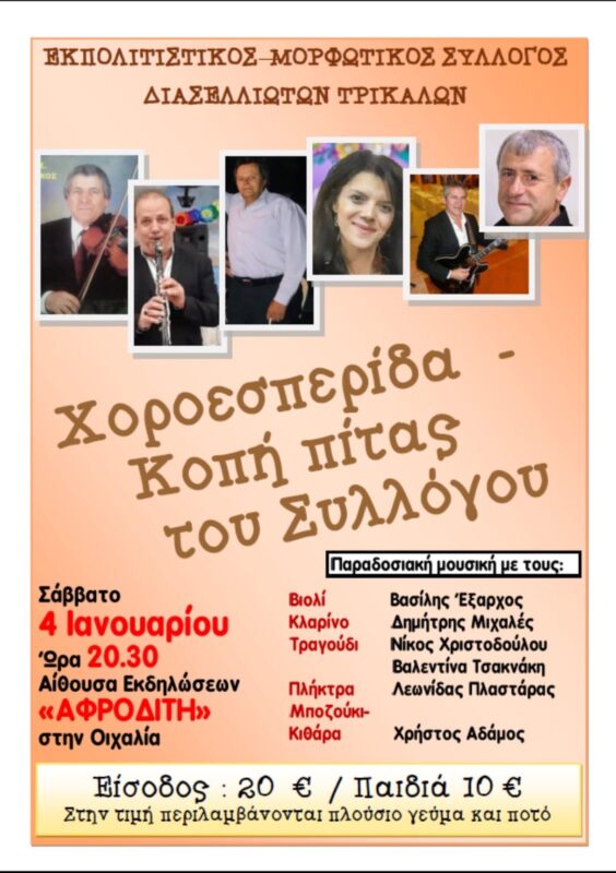 Με μεγάλη χαρά σας προσκαλούμε στην ετήσια χοροεσπερίδα που διοργανώνει ο Εκπολιτιστικός Μορφωτικός Σύλλογος Διασελλιωτών Τρικάλων! Η εκδήλωση θα πραγματοποιηθεί το Σάββατο, 4 Ιανουαρίου 2025, στο κέντρο Αφροδίτη στην Οιχαλία.