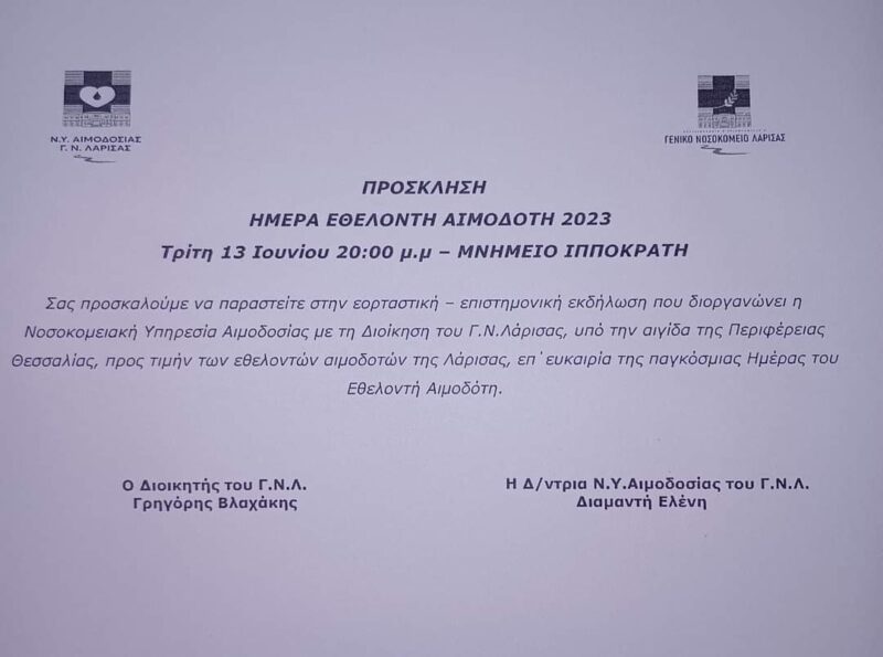 Αφιερωμένη στην Παγκόσμια Ημέρα Εθελοντή Αιμοδότη υπήρξε η εκδήλωση που διοργάνωσε στην Λάρισα, η Νοσοκομειακή Υπηρεσία Αιμοδοσίας με τη Διοίκηση του Γ.Ν. ΛΑΡΙΣΑΣ, υπό την αιγίδα της Περιφέρειας Θεσσαλίας, του Δήμου Λαρισαίων, προς τιμήν των εθελοντών αιμοδοτών. Κατά την εκδήλωση βραβεύτηκαν 25 από τις ομάδες που Συλλόγων και φορέων που προχωρούν στην διοργάνωση των εθελοντικών αιμοδοσιών σε συνεργασία με το Γενικό Νοσοκομείο Λάρισας.