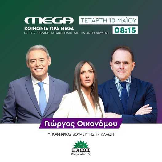 Στην ενημερωτική τηλεοπτική εκπομπή «Κοινωνία Ώρα Mega» θα μετέχει αύριο Τετάρτη ο υποψήφιος βουλευτής Τρικάλων του ΠΑΣΟΚ – ΚΙΝ.ΑΛ., Γιώργος...