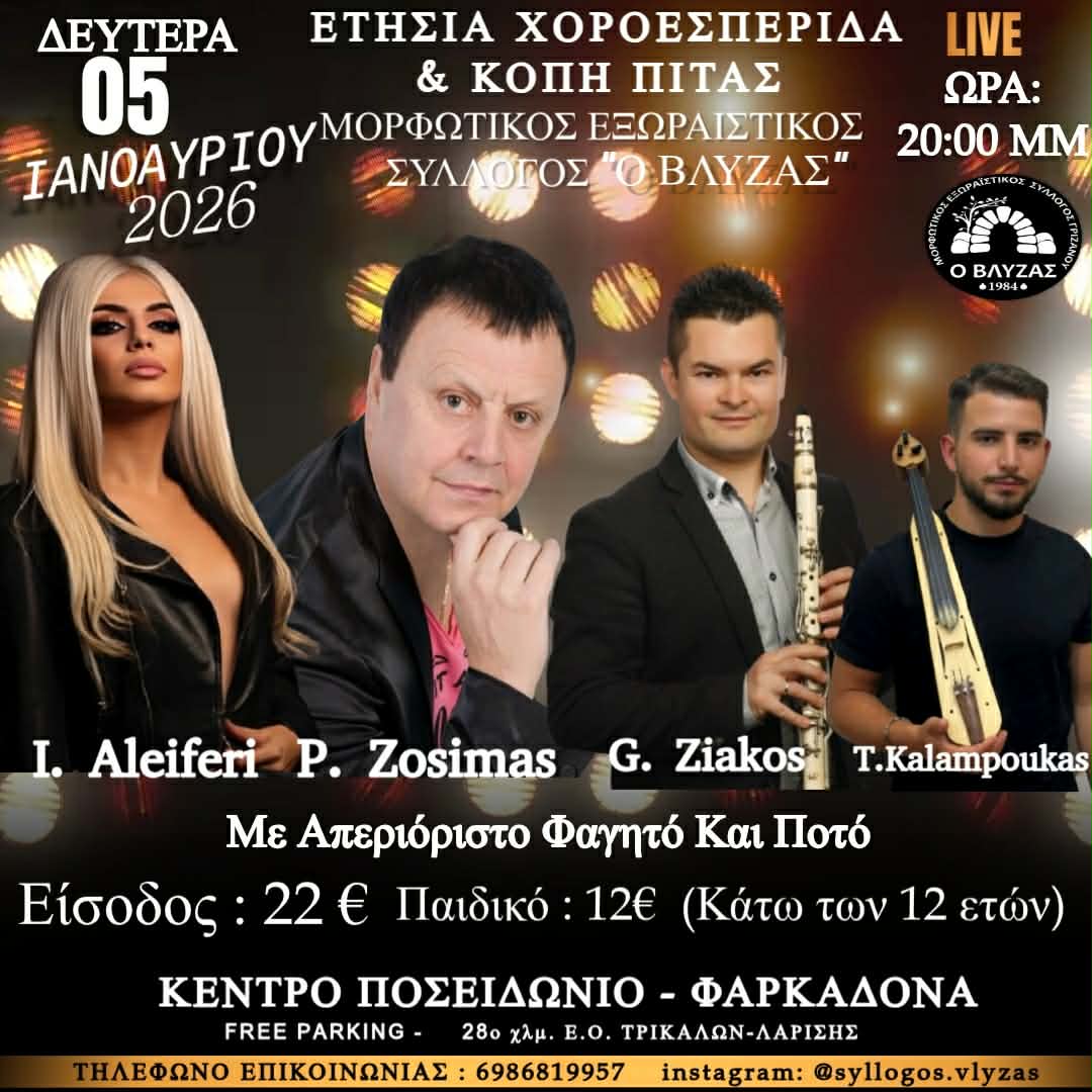Ο Μορφωτικός Εξωραϊστικός Σύλλογος «Ο Βλύζας» Γριζάνου προσκαλεί μέλη, φίλους και κατοίκους της ευρύτερης περιοχής στην Ετήσια Χοροεσπερίδα και Κοπή της Πρωτοχρονιάτικης Πίτας,...