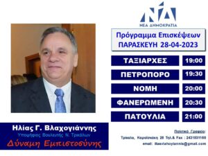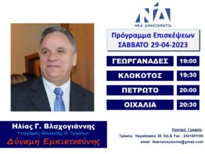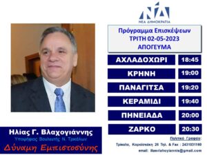 Με εντυπωσιακό τρόπο συνεχίζονται οι περιοδείες του υποψηφίου βουλευτή της ΝΔ, Ηλία Βλαχογιάννη σε όλο το φάσμα του νομού Τρικάλων....