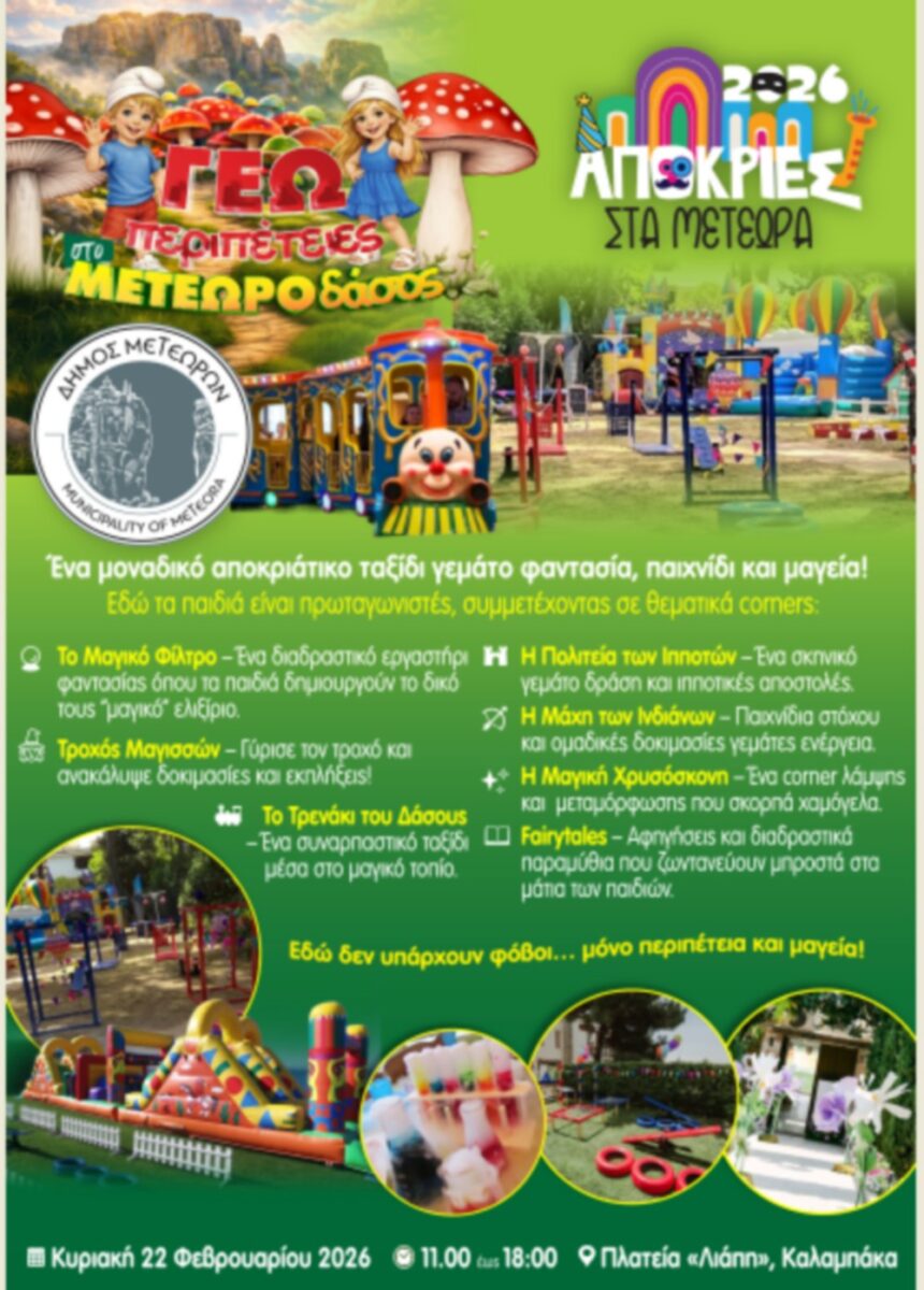 Ο Δήμος Μετεώρων προσκαλεί μικρούς και μεγάλους σε ένα μοναδικό αποκριάτικο ταξίδι γεμάτο φαντασία, παιχνίδι και μαγεία!Την Κυριακή 22 Φεβρουαρίου...