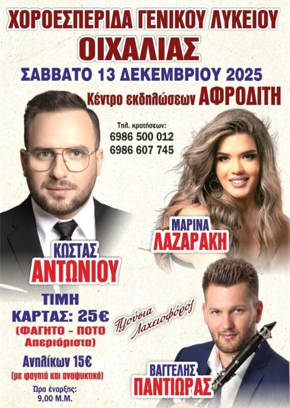 Το Λύκειο Οιχαλίας κάνει το μεγάλο «μπαμ» – Φέρνει τον γνωστό τραγουδιστή Κώστα Αντωνίου στη χοροεσπερίδα του