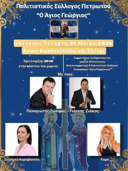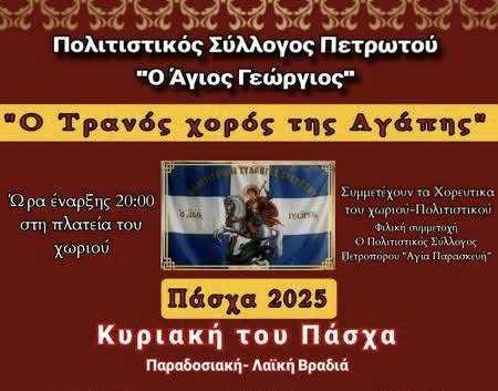 Ο Πολιτιστικός Σύλλογος Πετρωτού "Ο Άγιος Γεώργιος" προσκαλεί όλους τους κατοίκους και φίλους της περιοχής στο καθιερωμένο πανηγύρι που θα...