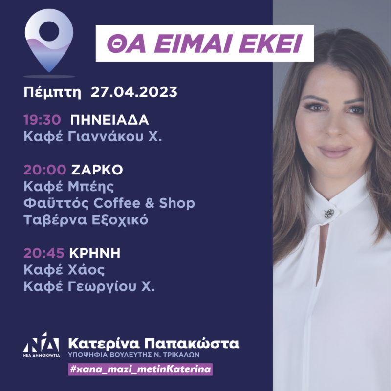 Την Παρασκευή, 28 Απριλίου 2023, η υποψήφια Βουλευτής της Νέας Δημοκρατίας, Κατερίνα Παπακώστα, θα επισκεφθεί τα χωριά Αμπελοχώρι, Ματονέρι, Καλομοίρα, Αμάραντο,...