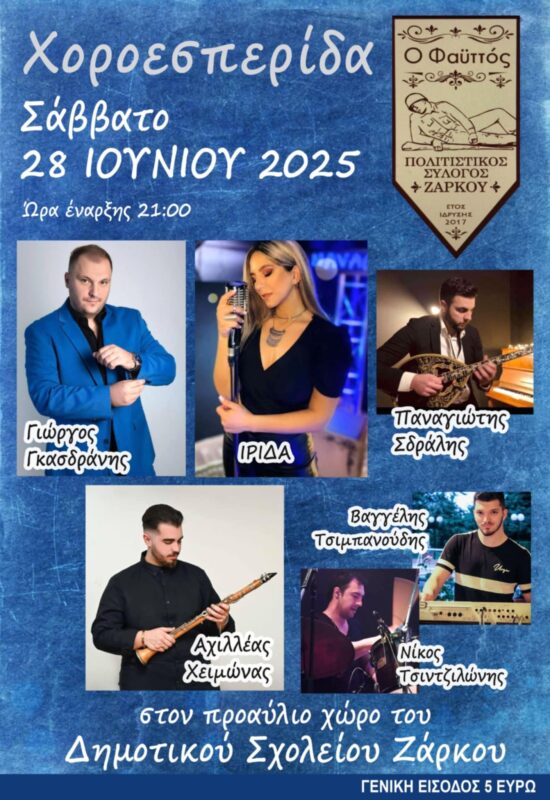 Ο Πολιτιστικός Σύλλογος Ζάρκου «Ο Φαϋτός» μας προσκαλεί σε μια μοναδική μουσική βραδιά το Σάββατο 28 Ιουνίου 2025. Δείτε το...