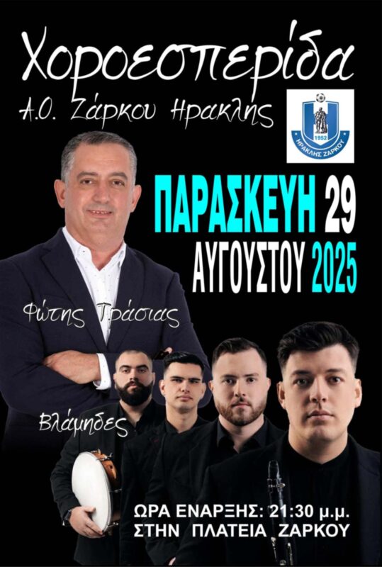 Ο Αθλητικός Όμιλος Ζάρκου «Ηρακλής» διοργανώνει μια ξεχωριστή χοροεσπερίδα την Παρασκευή 29 Αυγούστου 2025, στην πλατεία Ζάρκου, με ώρα έναρξης τις 21:30 μ.μ.. Το...