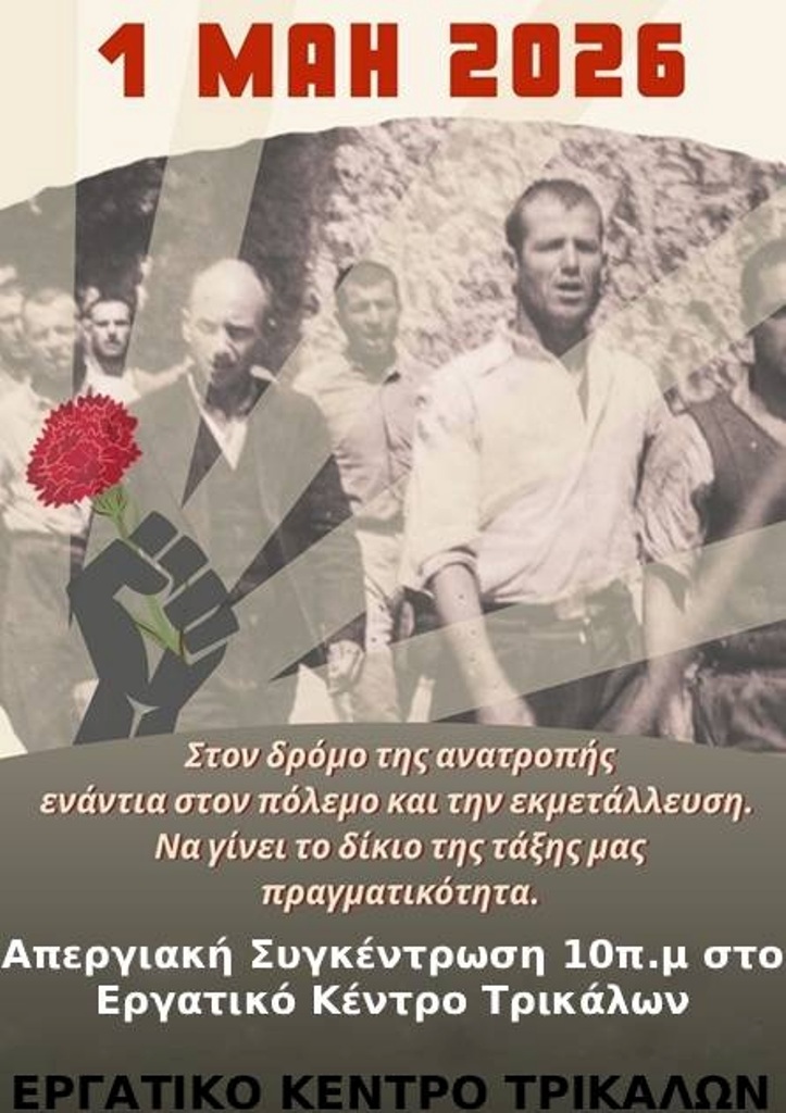 Σε θέσεις μάχης βρίσκεται το Εργατικό Κέντρο Τρικάλων, προετοιμάζοντας με μια πολύμορφη δράση τη φετινή απεργιακή Εργατική Πρωτομαγιά. Παίρνοντας τη σκυτάλη από τις κινητοποιήσεις του τελευταίου διαστήματος και απαιτώντας καμία θυσία για τα κέρδη και τους πολέμους τους, για να μην πληρώσει ο λαός τα σπασμένα της εμπλοκής και της στροφής στην πολεμική οικονομία, η Πρωτομαγιά γίνεται σταθμός κλιμάκωσης της πάλης.