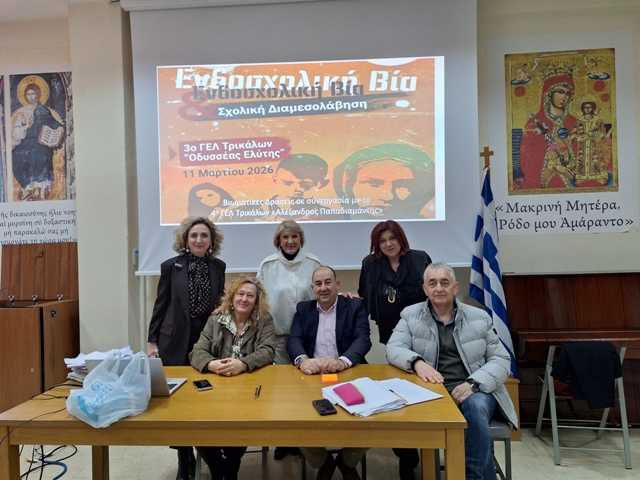 Την Τετάρτη 11/3/2026, ο Διευθυντής Δευτεροβάθμιας Εκπαίδευσης Τρικάλων κ. Αλέξανδρος Καπανιάρης, συνοδευόμενος από τον Προϊστάμενο τμ. Ε’ Εκπαιδευτικών Θεμάτων κ. Ιωάννη Ζάντζο επισκέφθηκαν το 3ο ΓΕΛ Τρικάλων «Οδυσσέας Ελύτης», στο πλαίσιο της παρουσίασης των εργαστηρίων ενδυνάμωσης για τη Σχολική Διαμεσολάβηση.