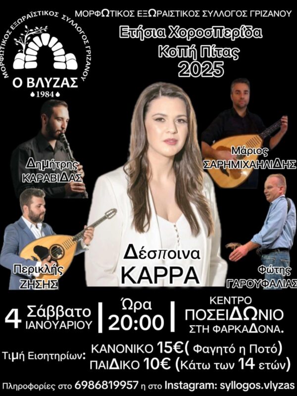 Ο Μορφωτικός Εξωραϊστικός Σύλλογος Γριζάνου "Ο ΒΛΥΖΑΣ" σας προσκαλεί να συμμετάσχετε στον Ετήσιο Χορό και στην Κοπή Πίτας του, που...